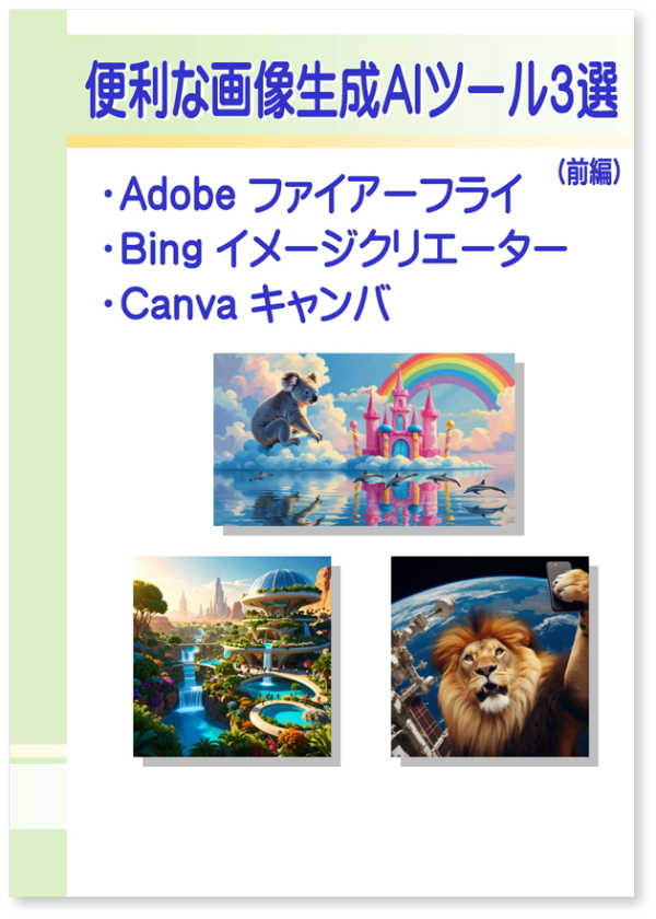 画像生成に特化した3つのツールの機能・手順・使い方などを大きな文字とカラー画像で分かりやすく進めることができます。